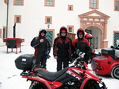 Zurück nach Tharandt heißt die Alternative. "Daisy" schickt Schneefall. Wunderschöner Winterwald machte das Fahren durch den Tharandter Wald zu einem Höhepunkt. Ohne Winterchaos erreichen wir kurz nach Drei Schloss Augustusburg. Das Wintertreffen beginnt. Der MC Görlitz e.V. im ADMV ist schon da und nimmt uns freundlich über Lautsprecheransage auf. Das Quad ist schon da. Wir lassen uns obligatorisch im Burghof mit Gleichgesinnten ablichten. Unser Simsonfahrer trifft zehn Minuten vor optimaler Ankunftzeit 16.00 Uhr ein.