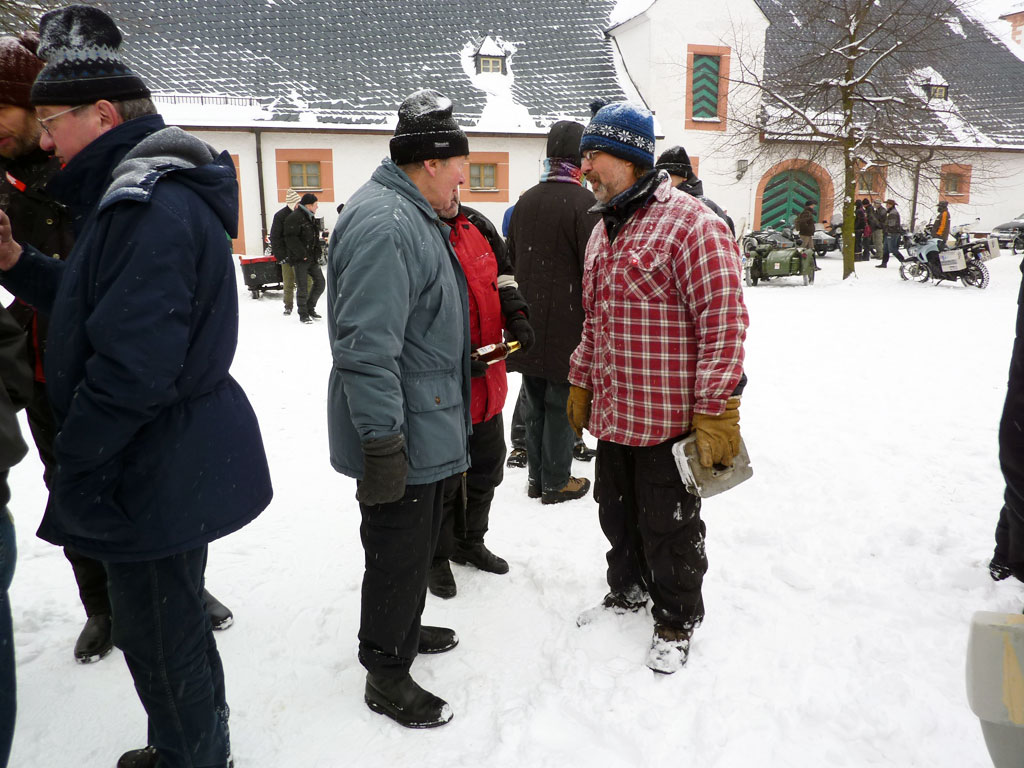 bekannte Gesichter in der motorradfreien Zeit zwischen Herbst und Frühjahr. Wunderbare "Daisy"!Am nächsten Morgen bedecken 15 cm Schnee unser Gespann. Das 40. Motorradfahrertreffen auf Schloss Augustusburg ist in vollem Gange. Auch hier hat "Daisy" zur Zurückhaltung gerufen. Weniger Zuschauer sind überall zu spüren. Um trotz "Daisy" einigermaßen gut nach Hause zu kommen, haben die Organisatoren der 9. Winterzielfahrt