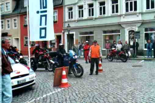 Ein Einzelsprint schicke die 82 Fahrer ab 09.00 auf die Mammuttour. Auch als der letzte Starter eine Stunde später Freital verließ, schüttete es immer noch von oben! Dies hielt sich bis Zschopau, dem ersten Etappenpunkt. Der MC MZ veranstaltete auf dem Markt einen Parallelslalom, wobei alle Fahrer wie bei Motorsporthighlights durch ein Sponsorentor und vom Sprecher begleitet wurden.