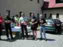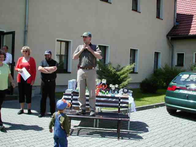 Nicht allzu weit war die nach ca. 700 km endlich die Zwangspause. Unser Rallyetross war in Stadtoldendorf das Rahmenprogramm zu einen hier stattfindenden "24 Stunden Marathonlauf". Jedes Fahrzeug musste auf die nagelneue Tartan-Bahn und wurde vom Stadionsprecher vorgestellt! Erst danach konnte die 90 minutige Pause eingelegt werden, bei der uns die Sportfreunde aus Stadtoldendorf sehr gut betreuten. Am Ende der Pause folgte die Wertungsprüfung am Zylinderkopf. Zündkerze raus- und reinschrauben auf Zeit!